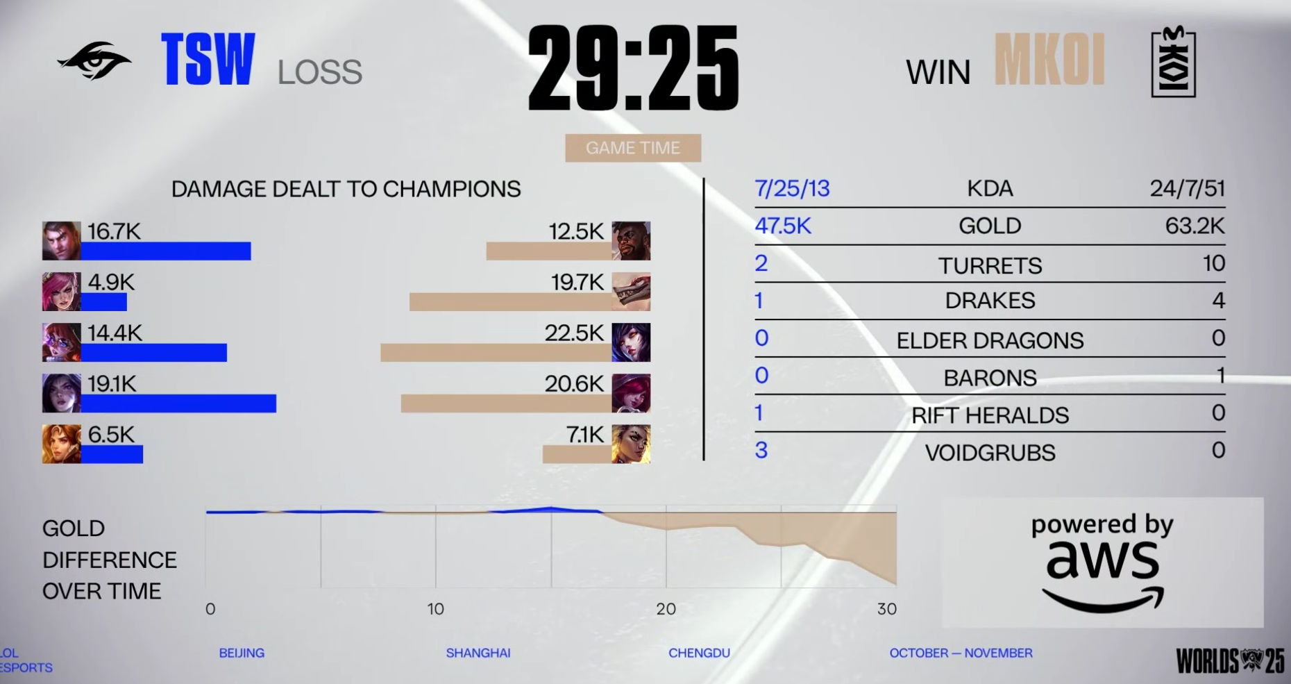 주요 쟁점: MKOI가 풀세트 접전 끝에 생존에 성공하며 2승 2패 조로 이동했습니다. Team Secret Whales는 1승 3패를 기록하며 롤드컵 여정을 마감하게 되었습니다.