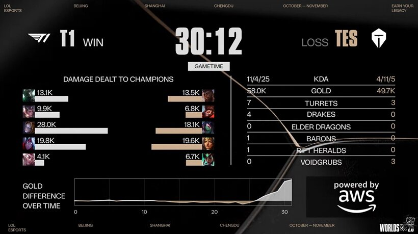 오늘 열린 2025 롤드컵 4강전! T1 vs TES LPL의 마지막 희망, TES를 상대로 T1이 3:0 셧아웃을 만들어버렸습니다... (진짜 30분 컷 3연속 실화냐고 ㄷㄷ)